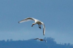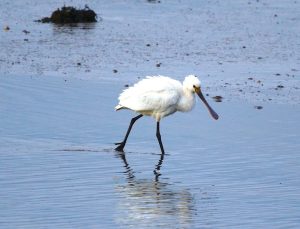 A fresh breeze, sunny intervals, and an absence of rain made for a most enjoyable trip today. Our winter visitors will soon be returning to their breeding grounds, and indeed some have already departed, leaving bird numbers a little sparse. But there was still plenty to enjoy, especially three Spoonbills which landed on the mud…