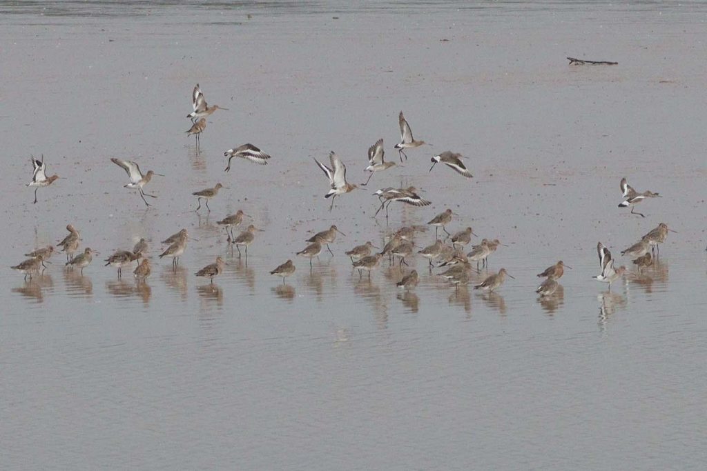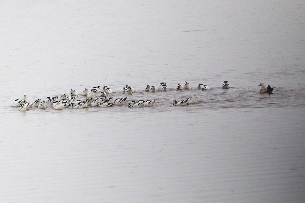A brisk shower then dampened things for a short while, but we used the poor visibility to motor briskly across the estuary towards Lympstone, where Shelduck, Bar-tailed Godwits and assorted gulls were present in good numbers. Our first Avocets were just below the Turf Hotel, and we encountered a flock of about thirty in a circling, tight, communal feeding frenzy – the dense flock rotating like a small whirlpool in deep water. This was a neat piece of behaviour that can be hard to see.