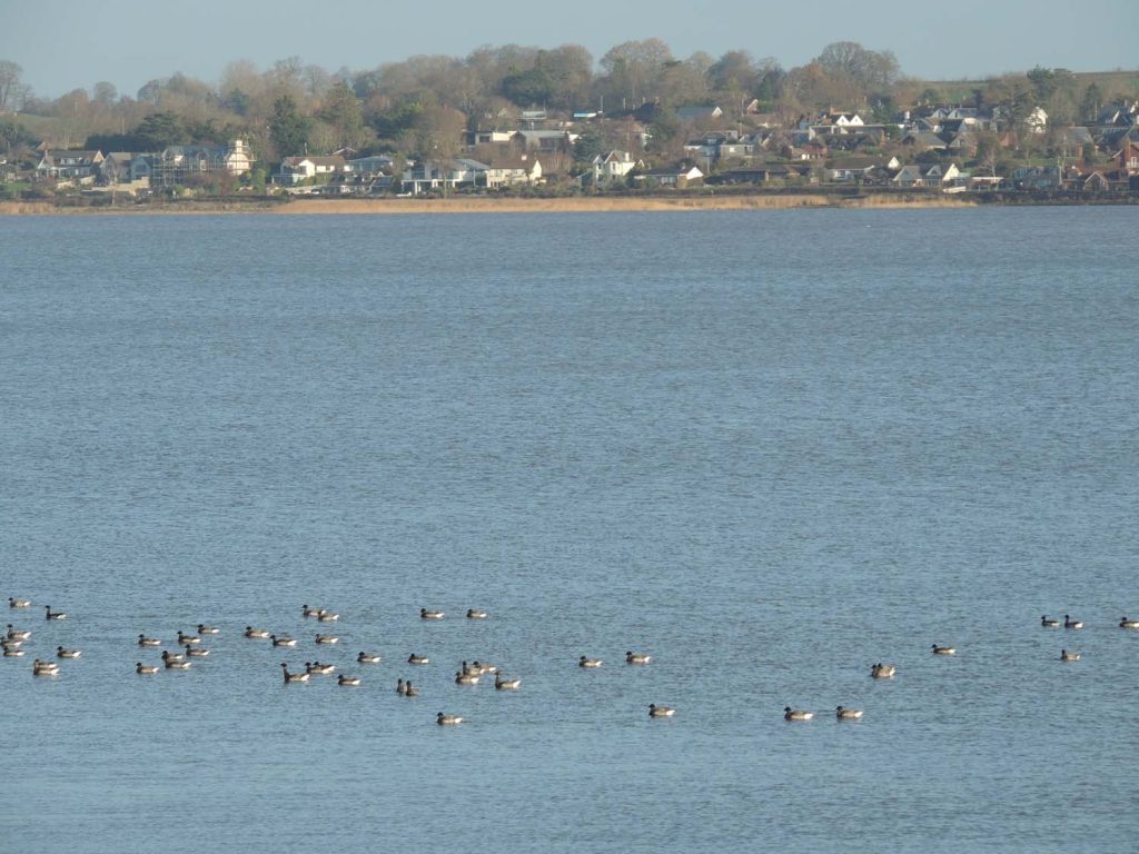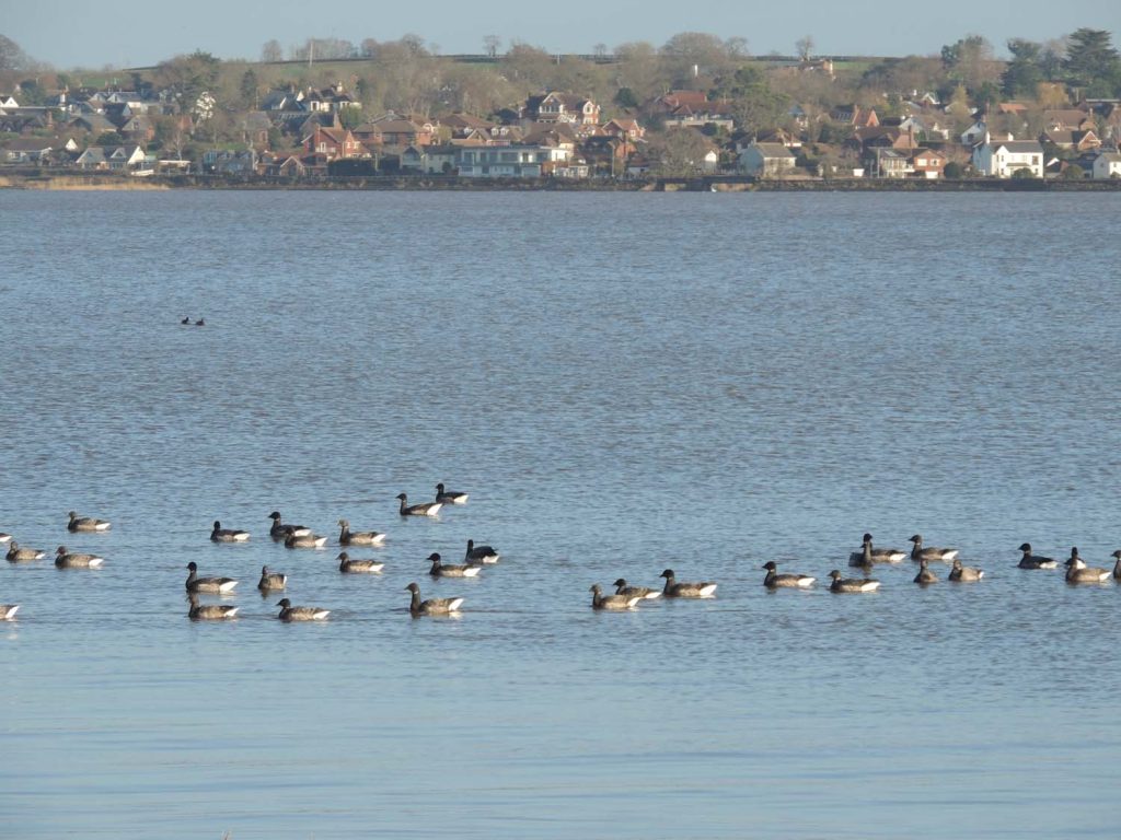 Today’s cruise resulted in good views of many waders and wildfowl in the upper reaches of the estuary, where the influx of flood water had pushed many species away from their normal feeding locations. Leaving a wind-blown Exmouth, there was some shelter behind the sand-spit of Dawlish Warren, and we could see many Brent Geese and Shelduck feeding in Shutterton Creek, together with waders such as Redshank, Greenshank, Bar-tailed Godwits, Curlew and Oystercatchers. They were all feeding busily before the incoming tide covered the mudflats and pushed them onto the adjacent fields. The strong wind had also displaced all the Shags from their favoured perches on mooring buoys onto sandy islands such as Bull Hill, so we were not able to see them at close range. However, this enabled an unusual direct comparison of the smaller Shags against the larger, and much commoner, Great Cormorants.