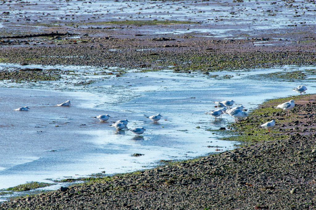 The Avocets were the highlights of today’s Guided Birdwatching Cruise. As the boat approached the huge mudbank opposite the Turf Hotel, the first group of ten Avocets were found, feeding in the shallow water, sifting for food with their distinctive ‘sideways-flick’ bill action. Their snowy white and contrasting dense black plumage glowed in the bright winter sunshine as they scurried around, looking for food in the short tidal window. The closer to Topsham we were, the more we saw; there were small flocks, large flocks, birds standing on the mud, birds sleeping on the mud on one leg, birds walking away from the boat, birds flying, and they obliged by being easily and closely visible from both sides of the boat. It was a spectacular show that was much appreciated by everyone. By the time we reached Topsham we had seen close on three hundred, a huge increase in numbers from earlier cruises and was indicative that winter has really arrived.