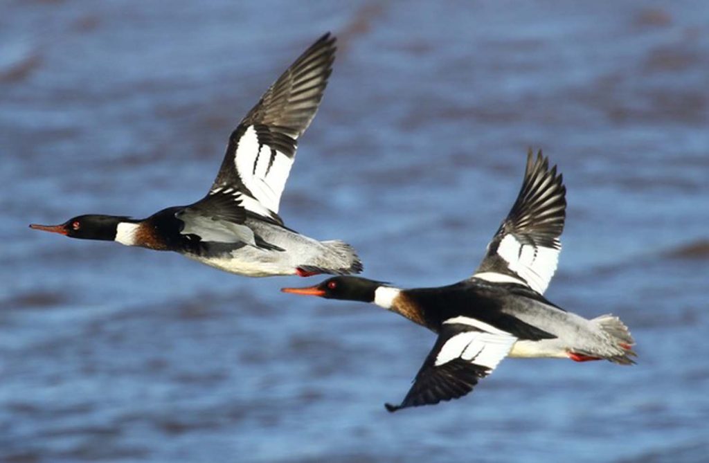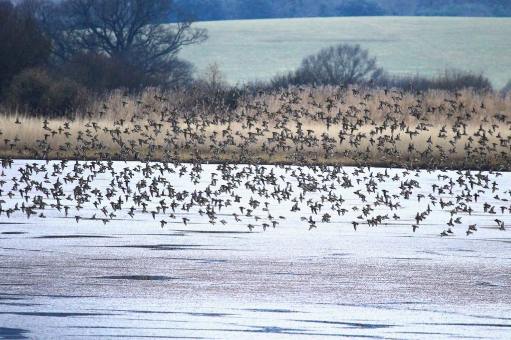 A small flock of Black-tailed Godwit was seen on the mud, and several more were seen again across the mudflats towards Topsham. Another Avocet flock was seen at close quarters off the Goat Walk area of Topsham for all to see. Common Redshanks were numerous again along this area, and a small flock of Bar-tailed Godwits flew towards the River Clyst. Lovely views of at least 11 Red-breasted Mergansers in groups of two, three and four were seen towards Topsham Quay and gave a great flypast as they headed downstream. We turned at Topsham Quay and headed for Exmouth; as we passed the roosting Golden Plover, they all decided to take off, showing great views as they circled the area – another winter spectacle.