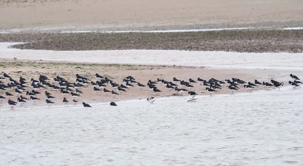 Once everyone caught their breath, we approached Cockle Sands and Bull Hill Sandbars. Oystercatchers were gathering together ready to go to roost, and on Bull Hill, gulls were plentiful too. As we approached the Dawlish Warren Wildlife Refuge area, more Oystercatchers were gathering and a large flock of Dunlin was seen taking off and landing – an estimated 1,000 birds going to roost.