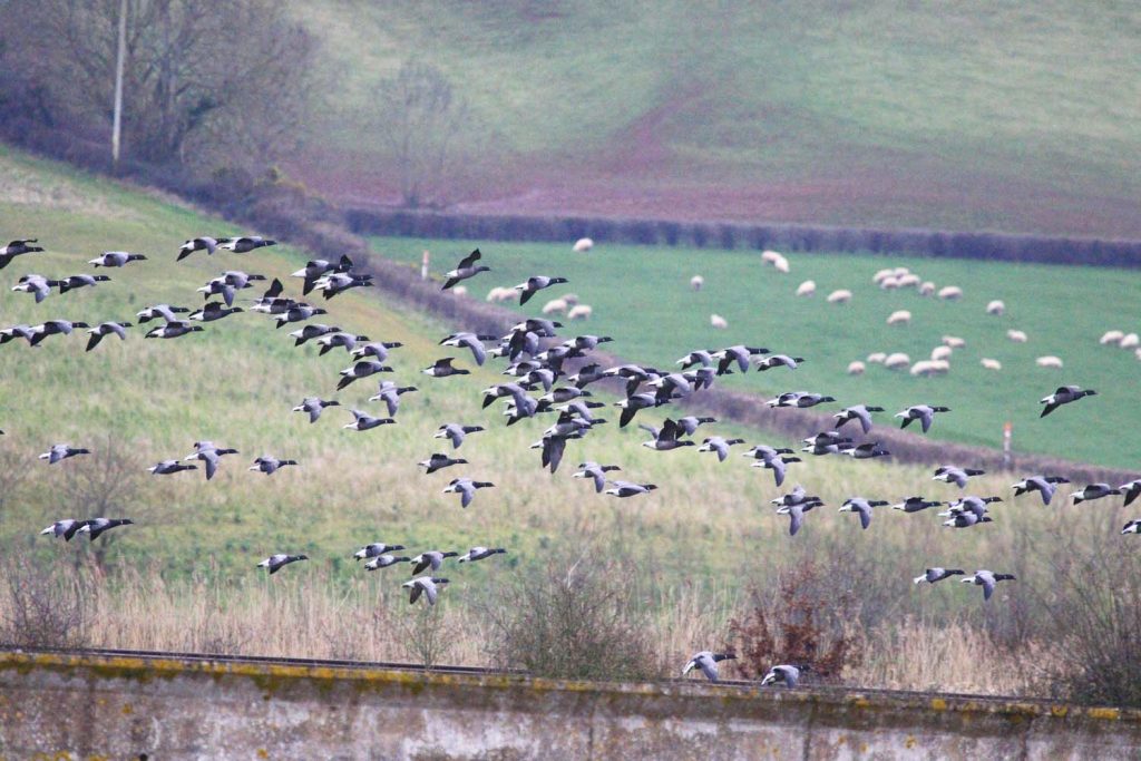 We continued upstream to view the heronry behind the Starcross Yacht Club, where we witnessed a Grey Heron entering the nesting area and landing in the oak trees. Heading towards Exton and the River Clyst, we had our first views of a beautiful Avocet flock, with several feeding and others taking flight, showing off their stunning plumage. Grey Plover, Dunlin, and Curlew were in abundance here, with plenty of gulls seen towards the Turf Lock Hotel. On the fields beyond the flood wall, 200+ Dark-bellied Brent Geese were seen feeding on the grassland – seeing several take flight was a wonderful sight.